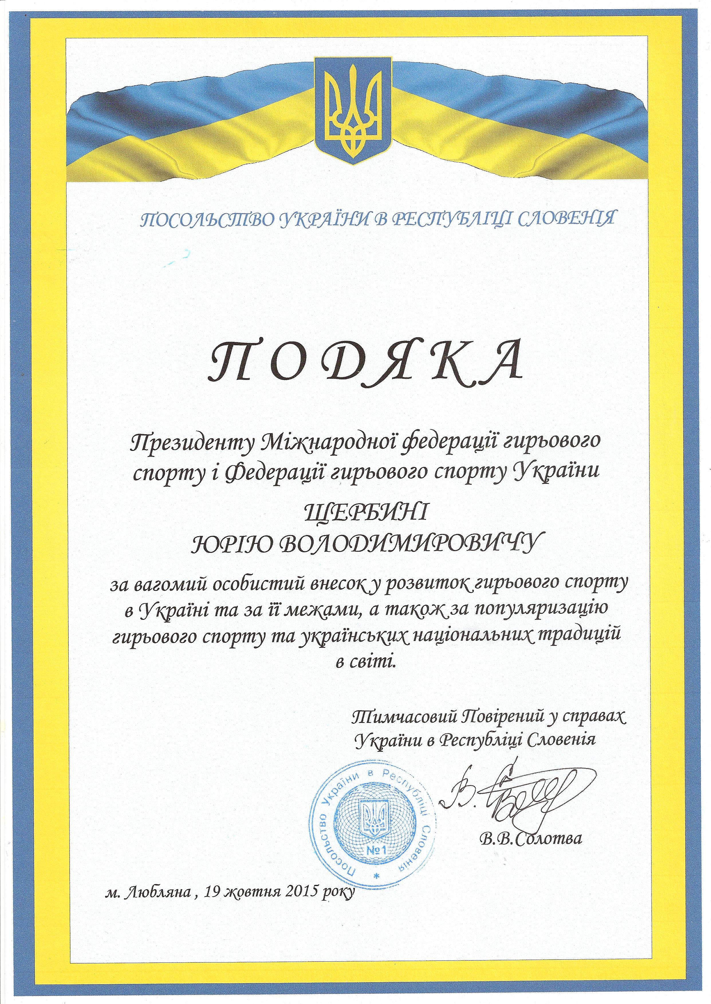 Посольство України в Республіці Словенія запросило всю українську делегацію в столицю Словенії Любляну, де розташоване Посольство України для вручення подяки за значний внесок у розвиток гирьового спорту в Україні Міжнародну федерацію гирьового спорту та Федерацію гирьового спорту України в особі президента Юрія Щербини.